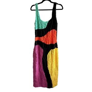 Mara Hoffman Ramona Midi Dress in Ambra Colorblock. Women's Size S / Small. Features sleeveless decorated with an abstract array of colors, fitted through the bodice and waist, pencil skirt cropped at mid-calf, scoop v neck, smocking throughout that creates a popcorn texture, unlined. 100% tencel. Great used condition, no notable flaws. As seen on Lori Harvey.