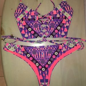 Looove this bikini but I have way too many to hold onto her. I have worn the top about 6 times and have never worn the bottoms. Both the top and bottoms are reversible and there is no padding in the top. The bottoms are a size Small and the top is a size Extra-Small. Offers welcome!