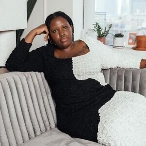 Amy is a stretchy bodycon dress with a square neck and long set-in sleeves, cropped at mid-calf. The dress is unlined and features a graphic, black-and-white color block print with a raised, textural popcorn finish. Made from 100% TENCEL Modal.