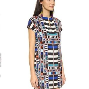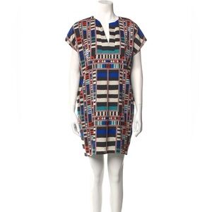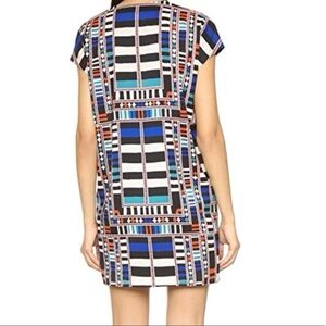 A lightweight Mara Hoffman shift dress with a multicolored geometric print. Split neckline. Cap sleeves. Lined. Fabric: Crepe. 97% polyester/3% spandex