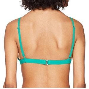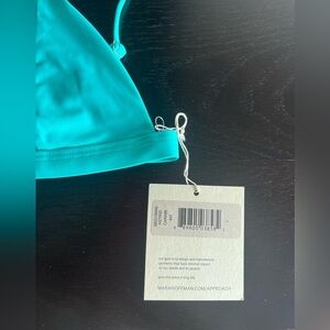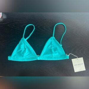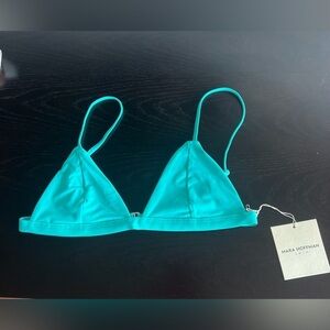 Mara Hoffman Teal Astrid SPF 50+ Triangle Bikini Top with adjustable straps and hook closure at the back