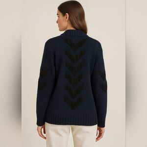 Stunning designer cardigan from Mara Hoffman. Crafted from a chunky knit warm wool in navy blue, this piece features unique leather appliqué detailing along the front panels, a button-down closure, and cozy ribbed trim. A rare find that blends modern edge with timeless knitwear style. Perfect for layering over dresses or pairing with denim for a chic, elevated look.