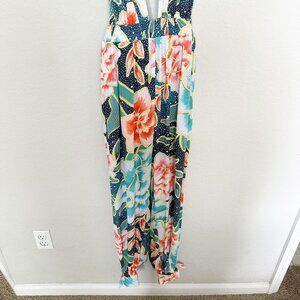 Mara Hoffman Swim Wrap Back Jumpsuit in Arcadia Indigo. Cotton blend. Hand wash cold. Halter strap ties around neck. Elastic waist. Cuffed hem with tie detail. Colorful floral lightweight 100% viscose fabric. *AI cover photo.