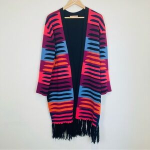 Mara Hoffman open front cardigan in vibrant bold stripe. Fringe detail at hem. Estimated to be a size medium.