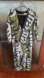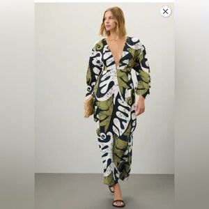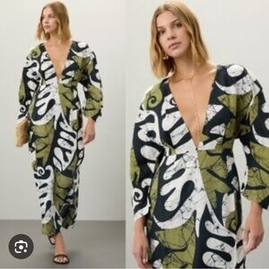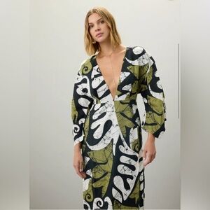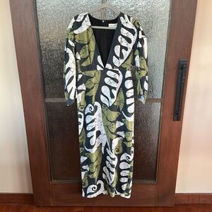 Chic dress with a bold green and black pattern. Features a deep V-neck and long sleeves.