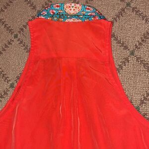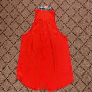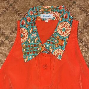 Marabelle bright orange sleeveless button down shirt w patterned collar. NWOT S. there are no care tags inside but feels like silk. Hem is rounded. Pleat under back collar.