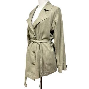 Maralyce Ferree Jacket Shacket Linen Cotton Beige Trench Belted Lagenlook XL. Preowned. Good condition. One button is missing from near the top, under the lapel fold There’s a hole on one lapel so I assume there’s supposed to be on the other (see photos 2 & 3). Comes from smoke free home. Ships out fast!
