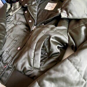 Maralyn & Me Cropped Puffer Bomber Jacket Shiny Olive Sz S Silky Soft Cozy