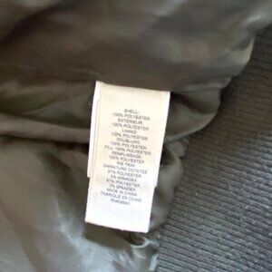 • Silky olive green bomber/puffer jacket with tall mock neck collar, ribbed hem, and pockets.