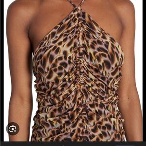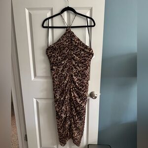 Chic leopard print midi dress. Halter neckline. Ideal for stylish outings.