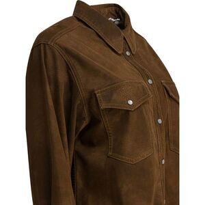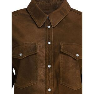 Marant Étoile "Karima" shirt made of faux leather with vintage construction. The model features a straight-cut construction, classic collar and long sleeves. The front closure with snaps complements the straight cuffs and patch pockets, both of which feature pearlized snaps. The rounded hem completes a straight silhouette, while the composition combines polyurethane, viscose, other fibers and polyamide.