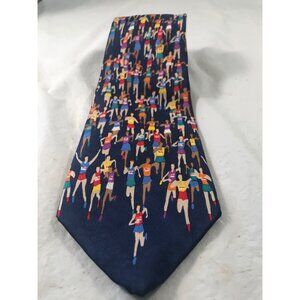 Designed for marathon enthusiasts, this "Marathon Runners by Alynn Neckwear" tie is a stylish addition to your wardrobe. Crafted from silk in navy blue, it features a whimsical multi-colored marathon running pattern.