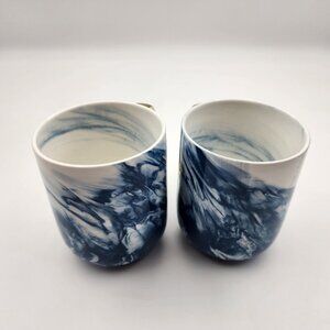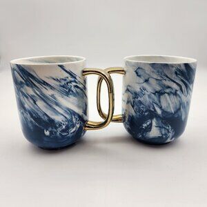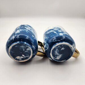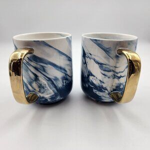 Marble Ceramic Coffee Mugs w Gold Tone Handle Tea Cup Blue White 4.25" Lot of 2