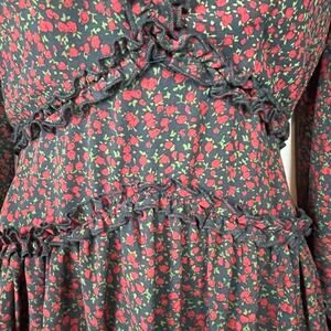 This Marble mini dress (Size S) blends coquette, fairycore, and gothic romantic vibes. Featuring a black and red ditsy floral print, tiered ruffle skirt, deep V-neckline, and open back, it’s perfect for a night out or a whimsical day look. The long sheer sleeves add a dreamy, ethereal touch, while the soft, lightweight fabric makes it ideal for layering year-round.