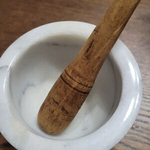The Mortar is in excellent condition. The wooden Pestle does have scuffs, marks, and indents throughout. This can be seen in photos.