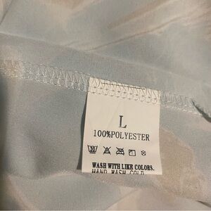 Stylish button-up blouse with a marble pattern and white buttons. Features shades of blue, white, and tan. Never worn. 100% polyester for a smooth, satin feel.