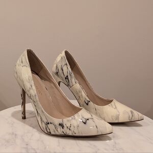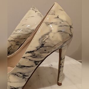 Elegant stilettos with a marble effect in off-white and grey/black. Couple marks on them as shown, one on the inside left shoe and the other on the back outside left shoe.