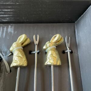 Set Of 8 Gold Rabbit Cocktail Picks With Marble Holder