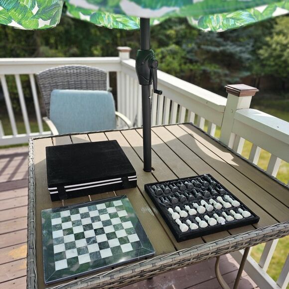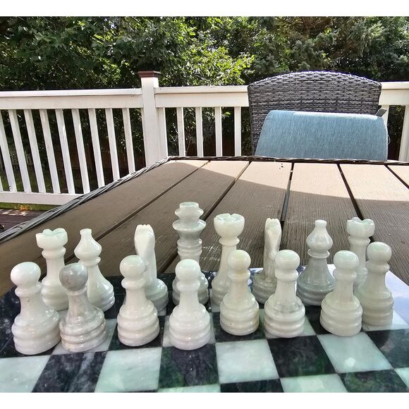 The hand-carved chess pieces are expertly crafted to perfection, with attention to detail that captures the essence of each pieces role on the board. The contrasting black and white marble onyx adds a touch of elegance to the classic design.