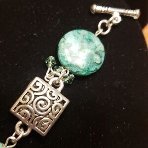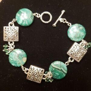 Marble Swirl Green Bead Silvertone Charm Bracelet