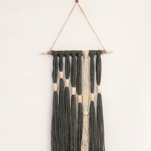 Marbled, soft, fuzzy yarn. Jute details. Wooden beads. 12 inch wooden dowel.