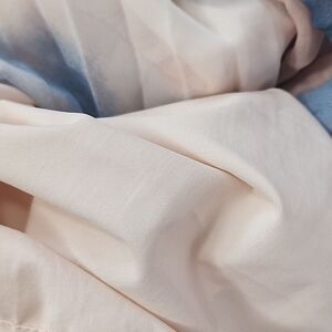This billowy pleated skirt would look great as an addition to your Spring to Summer wardrobe. Half lined so for the sheer bottom effect. Back elastic waistband, front is smooth at waist. Beautiful colors of Peach, Cream & Lavender Blue