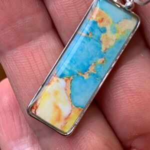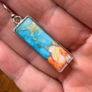 These unique statement earrings feature an abstract pattern inspired by kinsman turquoise.