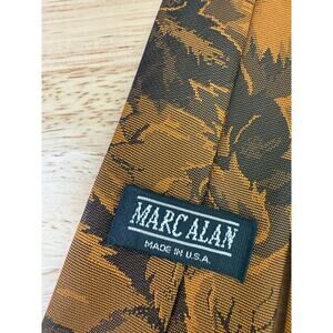 Elevate your style with this handsome Marc Alan neck tie. Made in the USA, this tie features a sophisticated amber gold leaf print that adds a touch of elegance to any outfit. Perfect for business meetings, special occasions, or adding a refined touch to your everyday look. This tie is in excellent condition and ready to wear. A timeless accessory that will surely impress!