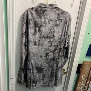 This Marc Anthony shirt showcases a distinctive distressed pattern in shades of gray, offering a modern and edgy aesthetic. Designed for casual wear, it combines comfort with style, making it a versatile addition to any wardrobe. The unique blend of darker and lighter tones creates a marbled effect, perfect for those seeking a standout fashion piece.