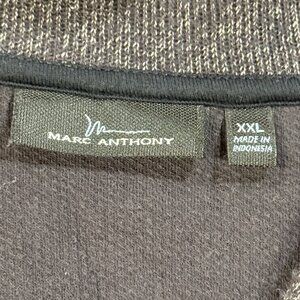 The product is a Marc Anthony men's cardigan sweater with pockets in size XXL, featuring a dark gray color with a marled pattern and tight-knit fabric. It has a collared neckline, long sleeves, button accents, and elbow patches, making it suitable for casual, business, or travel occasions. This sweater is machine washable and made of a polyester-cotton blend, with a regular fit and a classic style theme. It also includes pockets and is designed for winter, fall, or spring seasons, providing comfort and style for mon the go. Please note that the image with the model is an AI image and is only for reference. The item may not be exactly as shown.