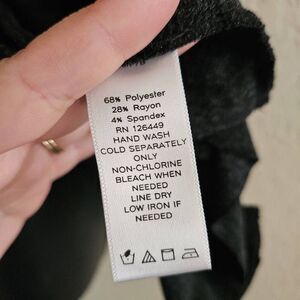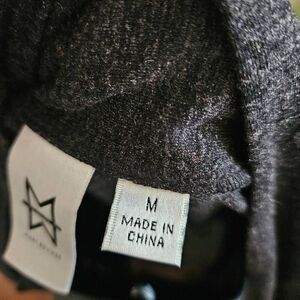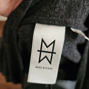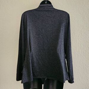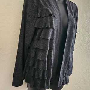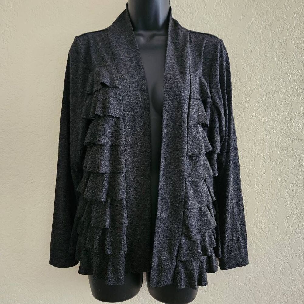 This is a dark grey cardigan by Marc Bouwer. It has ruffled detailing on each side.