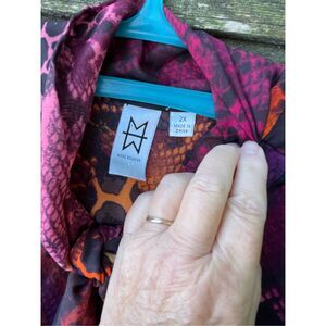 Marc Bouwer size 2X reptile print crepe tie neck button front blouse. Long sleeves with button cuffs. Semi sheer.