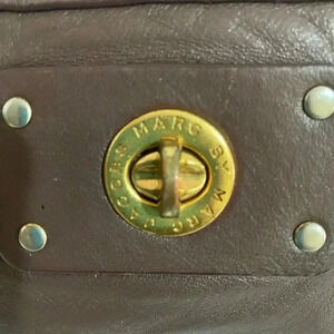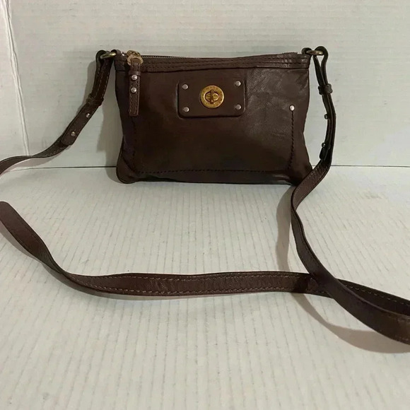 Marc By Marc Jacobs Brown distressed leather crossbody handbag with gold tone hardware main compartment jacquard fabric lining logo at hardware jacquard fabric lining lining have some stains exterior have creasing hardware have some marks tarnishing hight 6.5” width 9” depth.02 strap drop 24”adjustable The dimensions are based on approximately measurements before placing an order please check take a moment to view all photos using feature for a closer look