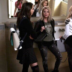 Marc By Marc Jacobs Leyna Dotty Fit & Flare Ponte Skirt in Black Multi as seen on Spencer Hastings in Pretty Little Liars season 5 episode 7. Same style, brand and color. The orange version was seen on Liv Rooney (Dove Cameron) in Liv and Maddie season 2 episode 5.