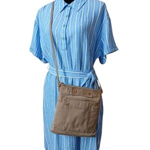 This Marc By Marc Jacobs crossbody bag in a sophisticated tan/khaki hue combines style and practicality. Its utilitarian design makes it an ideal choice for everyday use, offering a blend of fashion and functionality.