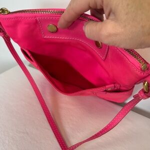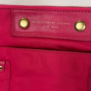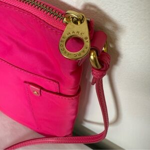 Marc by Marc Jacob’s Preppy Nylon Sia Crossbody Bag. Gorgeous bright pink, gold hardware, adjustable shoulder strap, slip pockets on exterior, top zip closure opens to a satiny logo interior, very clean with two slip pockets and one zip pocket. Plenty of space for your essentials. Chic and practical. Approximate measurements 10”x 9.5”. Two small spots barely noticeable see last picture for reference, overall very good preowned condition.