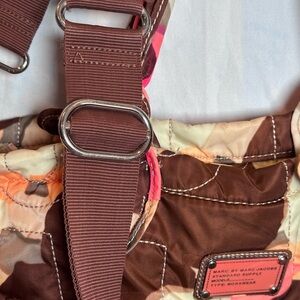 Nylon handbag. Silver and Salmon tone hardware. Black and white lining. 2 exterior side pockets. 1 interior zip pocket.