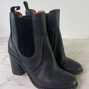 Authentic pair of women’s Marc Jacobs pull on booties. Black leather body with laser etched upper sole detailing. Size 38. In good condition. Chunky block heel booties.