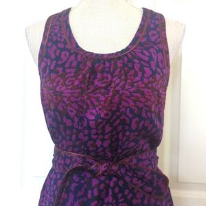 Stylish sleeveless dress with a bold leopard print. Features a tie waist for a flattering fit. Perfect for a night out. 100% Silk