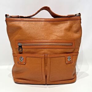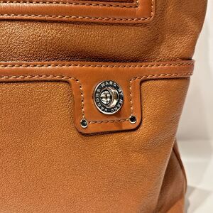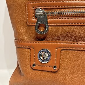 This is a Marc by Marc Jacobs Totally Turnlock Farideh Tote Shoulder Hobo Bag made of brown buffalo leather. It has a square shape with a pebbled finish and measures 14"x14"x6". The bag features a magnetic and turn lock closure, silver hardware, and a brown top handle. The interior is lined with a beige color and the bag is designed for women. The brand is Marc Jacobs and the style is a shoulder bag. Thank you!