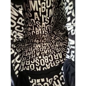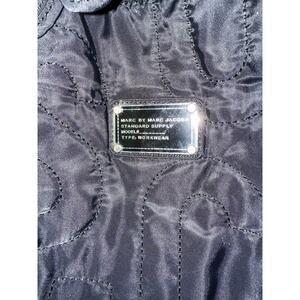 Black quilted-style nylon with top stitching that spells out Marc Jacobs