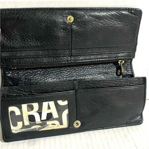 Marc By Marc Jacobs black leather wallet with gold tone hardware main compartment 3 cash slots 5 cards slots 1lD slots logo at front lining have some stains hardware have some time trashing exterior have creasing hight 3.25” width 7.5”The dimensions are based on approximately measurements before placing an order please check take a moment to view all photos using feature for a closer look