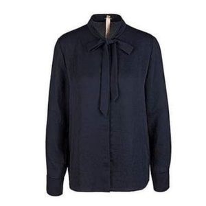 This bow-neck blouse is made from a flowing material and is very comfortable to wear. The bow is threaded through metallic eyelets. The cuffs are narrow and have a round, metallic button. The inverted pleat at the back and the concealed button placket complete the look.
