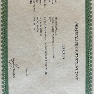 Beautiful Cherry Wood Frame. Authentication Certificate on back. Facsimile Signed. Hanging wire included. Perfect for Anniversary.