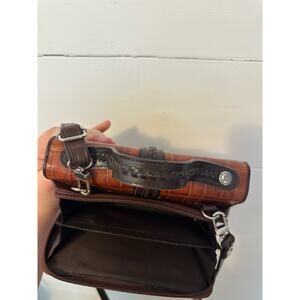 Marc Chantel brown leather croc print purse with braided details. Top handle and adjustable crossbody strap. Some cracking on the inside lining but otherwise in very good, clean condition.