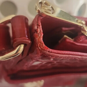 MARC CHANTAL RED CROC LEATHER HANDBAG WITH SHOULDER STRAP, GOLD ACCENTS. Pre-Owned, in good used very clean condition. Well made, red, crocodile leather. The front of the bag includes two zipped pockets. One of those has gold triangular accents with a gold accented zipper pull. The back side also has a zipper pocket plus a smaller reinforced pocket for a cell phone/keys/credit cards, etc. The inside is lined with linen fabric with the initials MC. There are two open pockets plus a zippered pocket. An adjustable shoulder strap is attached with secure gold hardware. This is a beautiful shoulder handbag. The red glossy finish will make it a conversation piece. There is a spot by the top zipper where there is a bit of peeling of the leather. (see last photo)