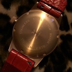 Beautiful Marc Coblen watch! This has only been worn 1 time! It is stainless steel dipped in rose gold, with a red leather alligator skin band. It also has red Swarovski crystals around the face. The battery does need to be replaced. This watch is water resistant.
