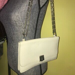 This is a gorgeous vintage Marc Cross Vintage Smooth Light Grey Leather Heavy Chain Strap Envelope Bag