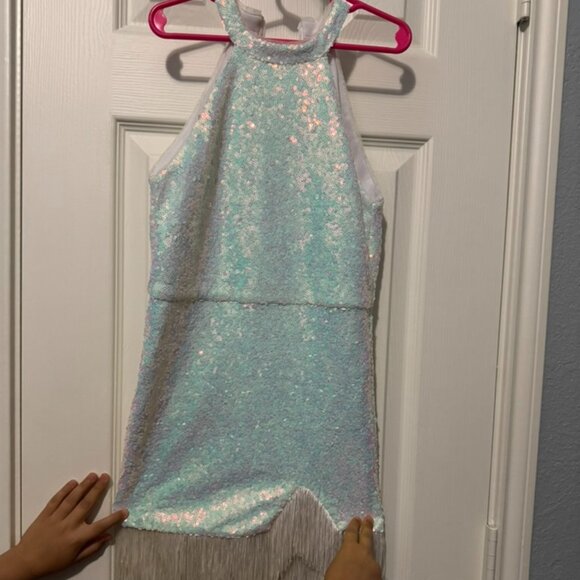 A chic little white cocktail dress crafted for maximum movement and glamour. The dress features fringe detailing that sways with every step, adding playful texture and visual flair. Fully lined for comfort and structure, this versatile piece is ideal for pageants, semi formal occasions, or any event where a youthful, effervescent look is desired.