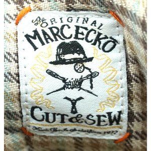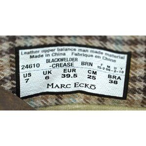 Marc Ecko Cut & Sew Blackwelder brown leather ankle boots. They lace up the front and also have a strap that buckles across the top of the foot. They are tagged as a Men's size 7. Overall, great pre-owned condition!